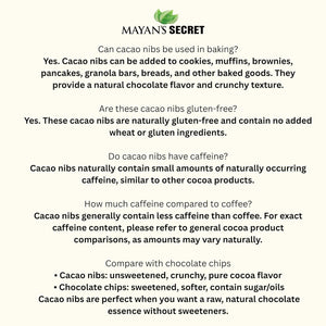 Sustainable Sourcing: We are committed to responsible sourcing practices. Our cacao nibs is derived from sustainable farming methods, ensuring minimal impact on the environment. By choosing Mayan's Secret, you are supporting ethical and sustainable agriculture.