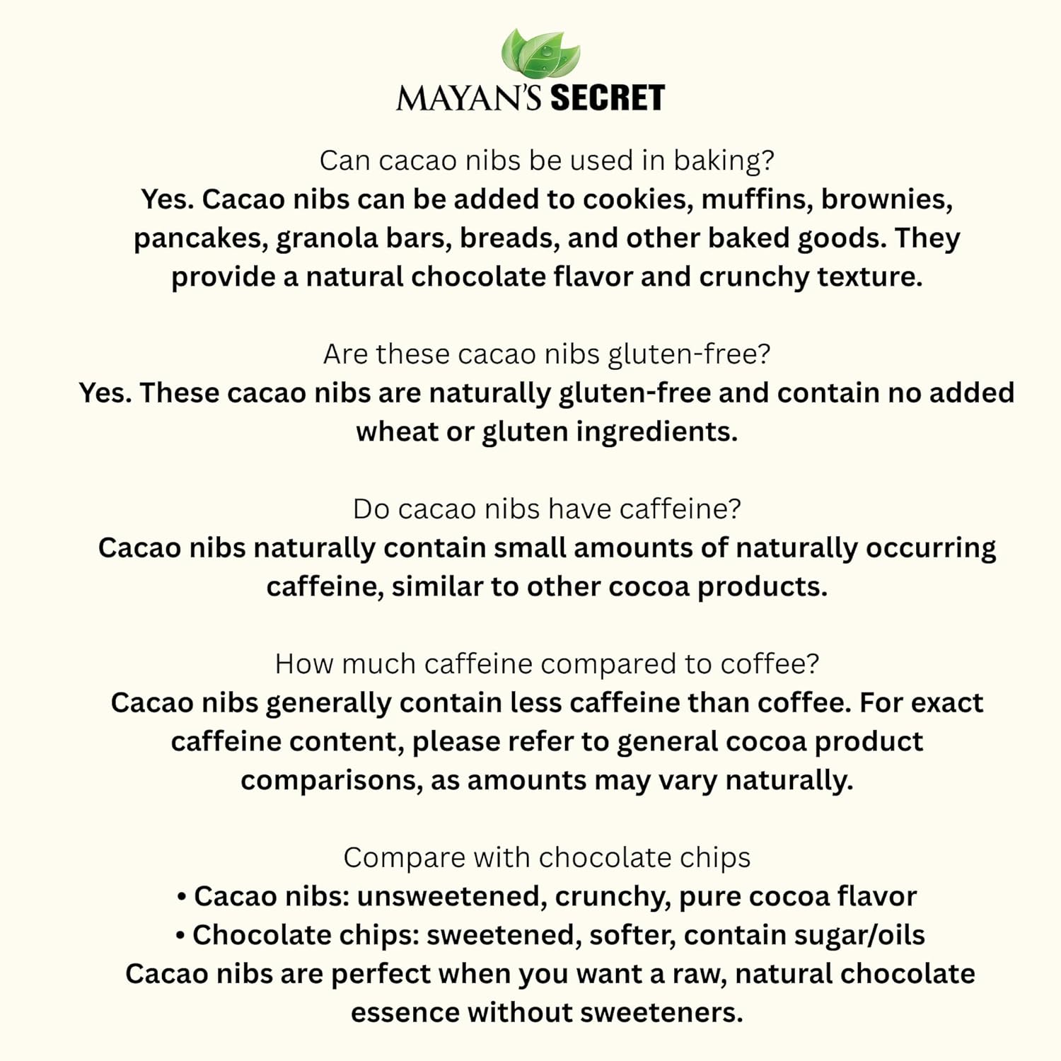 Versatile Usage: Whether you are a health-conscious individual, a fitness enthusiast, or a culinary explorer, Mayan's Secret Cacao Nibs can be a valuable addition to your pantry. Use it in smoothies, protein shakes, energy bars, pancakes, baked goods, and more to enjoy its nutritional benefits and delightful flavor.