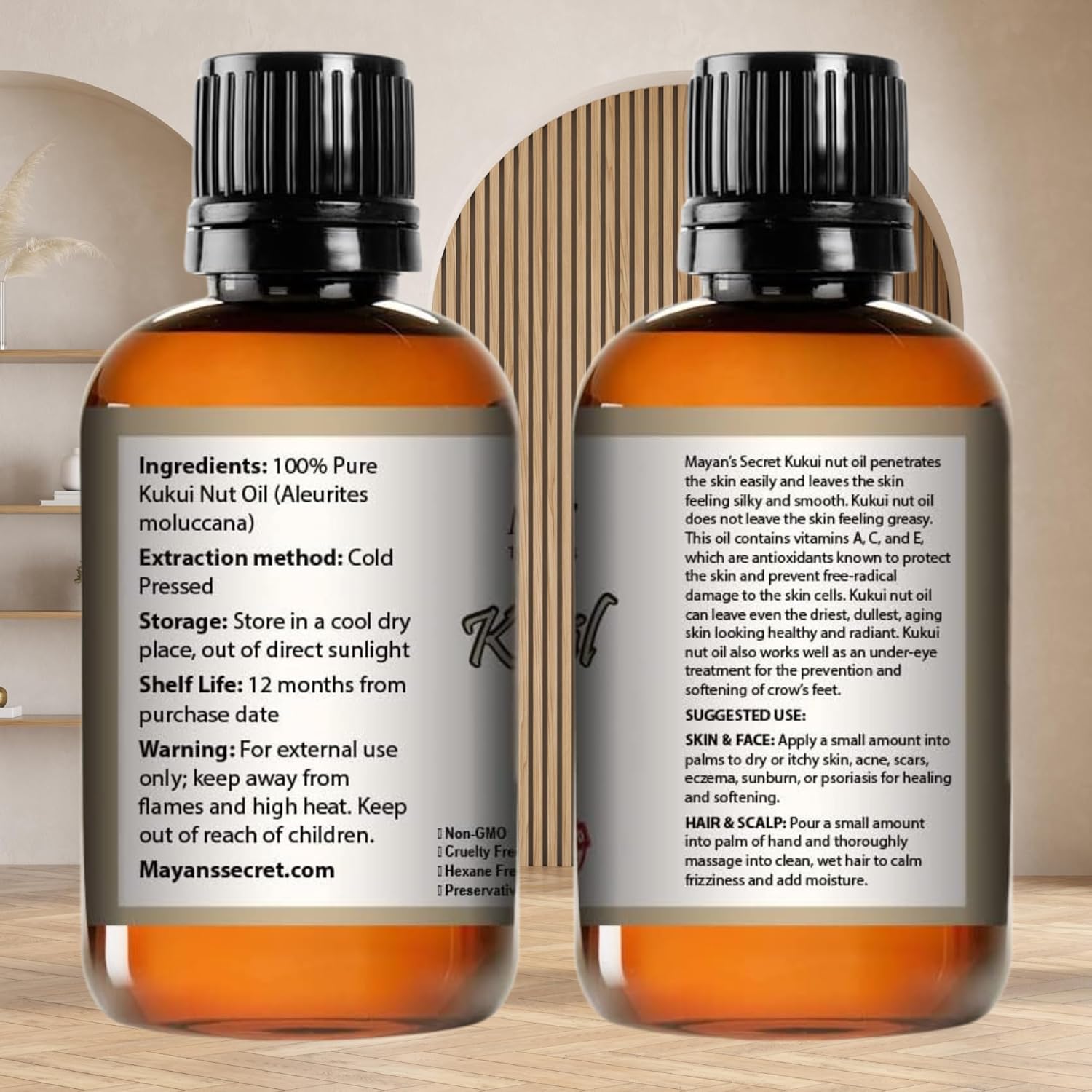 Natural Elixir: Mayan's Secret Kukui Nut Oil is derived from meticulously selected kukui nuts, known for their purity and rich nutritional content.