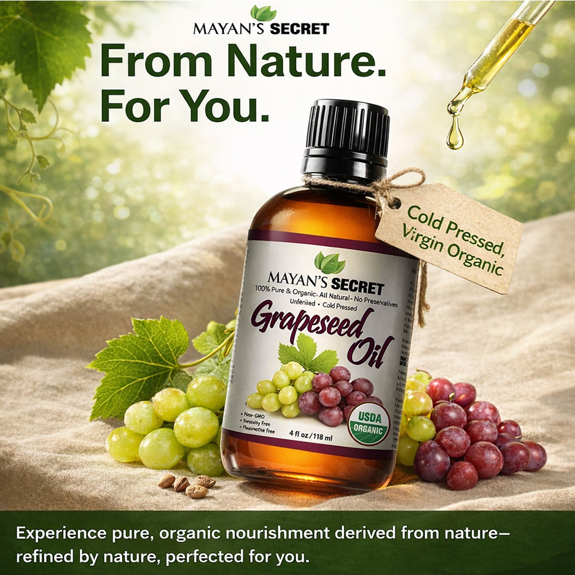 Experience the natural power of organic grapeseed oil. Mayan’s Secret Grapeseed Oil is cold pressed and unrefined to help preserve naturally occurring antioxidants, essential fatty acids, and Vitamin E. This lightweight oil absorbs quickly and leaves hair and skin feeling soft, smooth, and refreshed without a greasy residue.