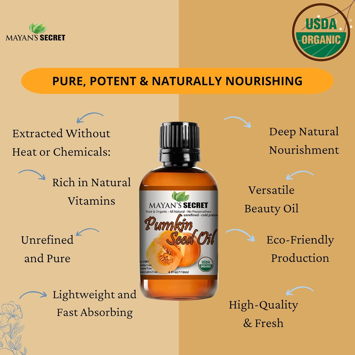 Discover the power of Mayan’s Secret Organic Pumpkin Seed Oil, a cold pressed unrefined beauty oil rich in natural vitamins antioxidants and essential fatty acids that help support healthy looking skin hair and scalp.