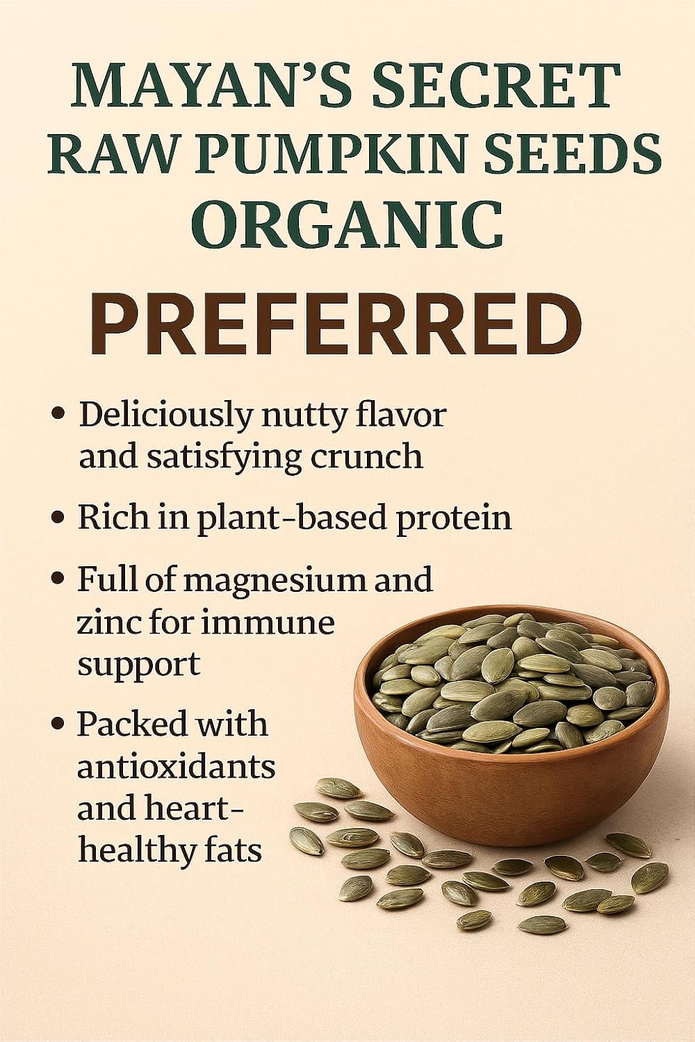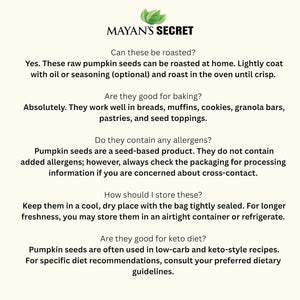 Natural and Pure: Mayan's Secret Pumpkin Seeds are 100% natural and pure, free from additives, ensuring an authentic snack. Premium Quality: Sourced with care, these pumpkin seeds meet high-quality standards, providing you with a premium snack that's both delicious and nutritious. Rich in Nutrients: These pumpkin seeds are naturally rich in essential nutrients, making them a wholesome and beneficial choice for snacking. Versatile Use: Mayan's Secret Pumpkin Seeds are a versatile ingredient, perfect for snacking on their own, adding to salads, or incorporating into various recipes for added crunch and flavor. Satisfying Crunch: Enjoy the satisfying crunch and earthy flavor of Mayan's Secret Pumpkin Seeds, making them a delightful and healthy snack option.