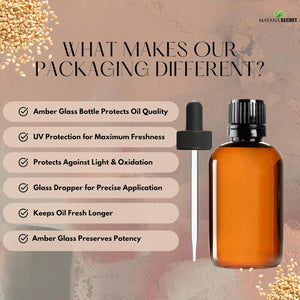 Amber Glass Bottles and Glass Droppers: We prioritizes the quality of our oil by utilizing amber glass bottles and glass droppers, safeguarding it from light and external factors. This preserves the oil's potency that promotes best skincare.